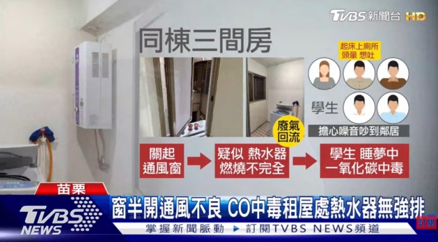 近日天氣寒冷,正是發生一氧化碳中毒的高峰期,蔡建宗副院長提醒租屋族,要特別留意瓦斯熱水器安裝的地點及管路,包括熱水器不適合放在加蓋的陽台或室內,應避免在陽台加裝門窗及晾曬大量衣物,若安裝室內型熱水器,必須裝設排氣管,使用熱水器時須注意室內空氣流通無虞,不要因為天冷或下雨就關閉窗戶,最好安裝一氧化碳濃度的偵測警報器,早期預警以防止中毒。