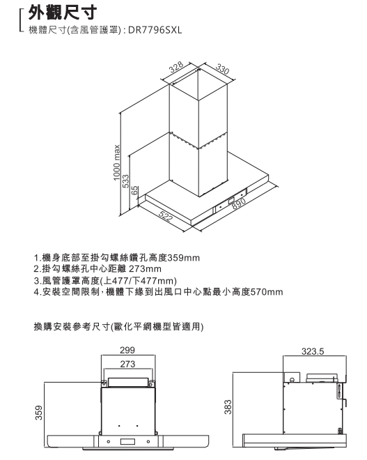 櫻花牌DR7796SXL歐化除油煙機-渦輪變頻 智能風控系列(90公分)