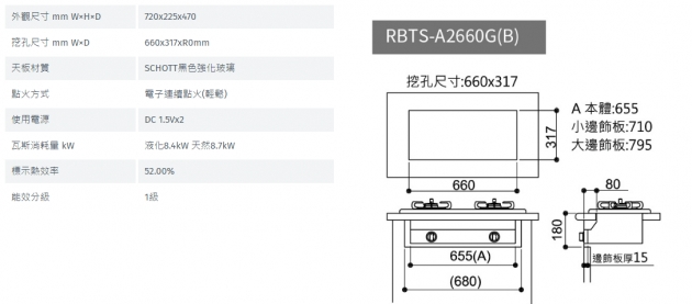 林內牌嵌入式緻溫玻璃雙口爐RBTS-A2660G(B)