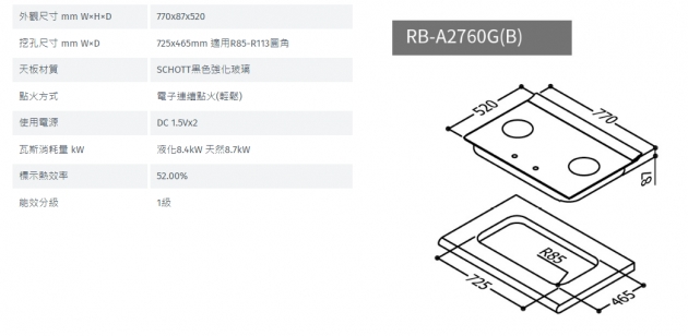 林內牌檯面式緻溫玻璃雙口爐RB-A2760G(B)
