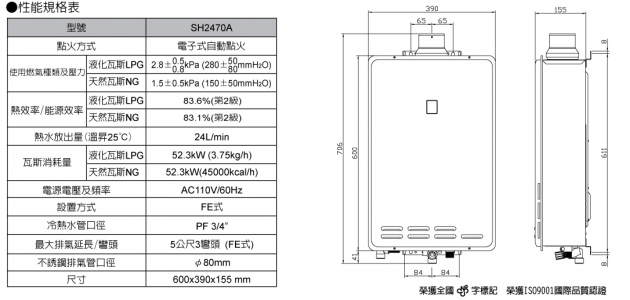 櫻花牌SH2480(日本)數位恆溫強制排氣熱水器