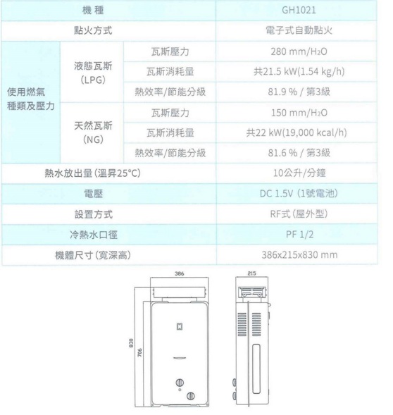 櫻花牌GH1021(屋外型)10公升(公寓型) 抗風型熱水器