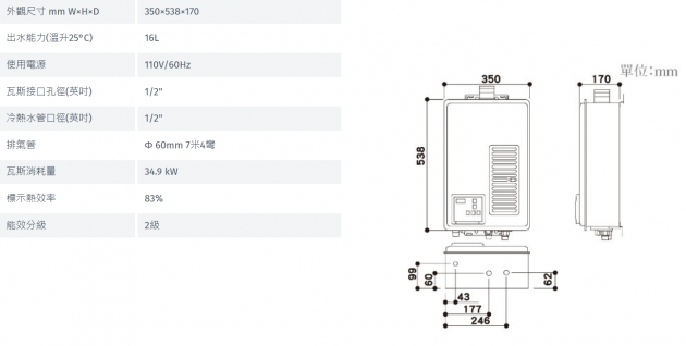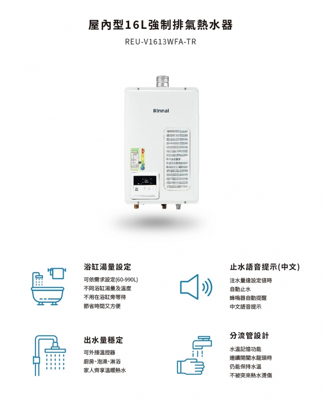 林內牌(日本進口)REU-V1613WFA-TR 屋外強制排氣型16L熱水器