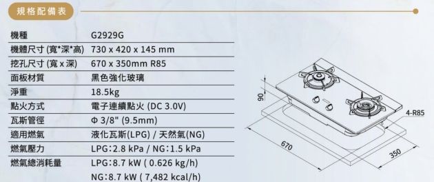櫻花牌G2922AGB檯面瓦斯爐